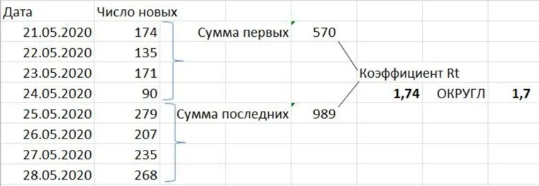 Согласно внутренним инструкциям Роспотребнадзора, коэффициент распространения инфекции (Rt) высчитывается как соотношение суммы заболевших за последние четыре дни к сумме заболевших за предыдущие четыре дня (см. расчет). Еще в начале недели коэффициент распространения в Свердловской области составлял 1,2 — 1,3, но из-за высоких цифр по новым заболевшим сегодня он составляет 1,7 (для перехода к первому этапу снятия ограничений он должен быть менее единицы).