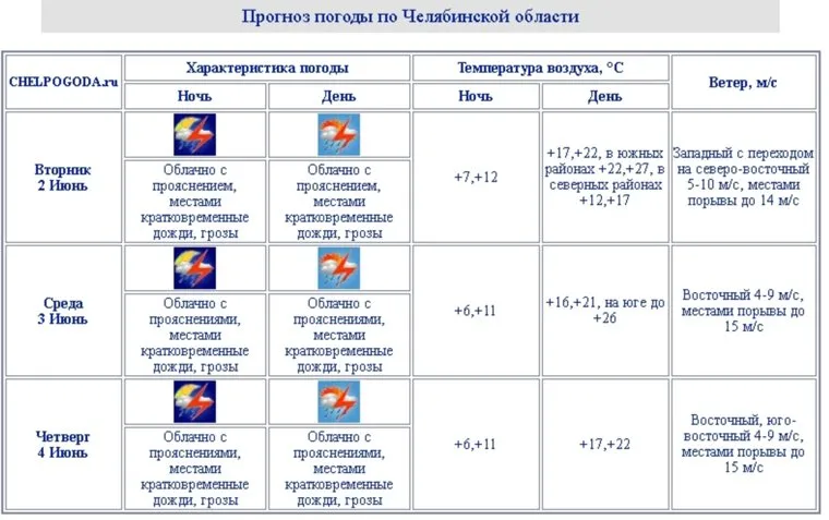 По данным Челябинского ЦГМС, 2, 3 и 4 июня по всей территории области днем и ночью прогнозируются кратковременные дожди и грозы. Столбик термометра на севере области может опускаться до плюс 12 градусов. Аномальная жара, царившая на выходных на Южном Урале, сохранится в некоторых южных районах во вторник и среду — плюс 26-27 градусов. Но к четвергу и на юге станет прохладнее — до 22 градусов.