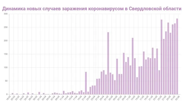 292 случая заболевания коронавирусом за сутки — это новый рекорд для Свердловской области за все время. Показатели, близкие к этому, отмечались накануне ( 283 случая ), а также всю предыдущую неделю (25 мая — 279 случаев , в четверг, 28.05 — 268 случаев, в субботу и воскресенье — 261 и 265 соответственно).