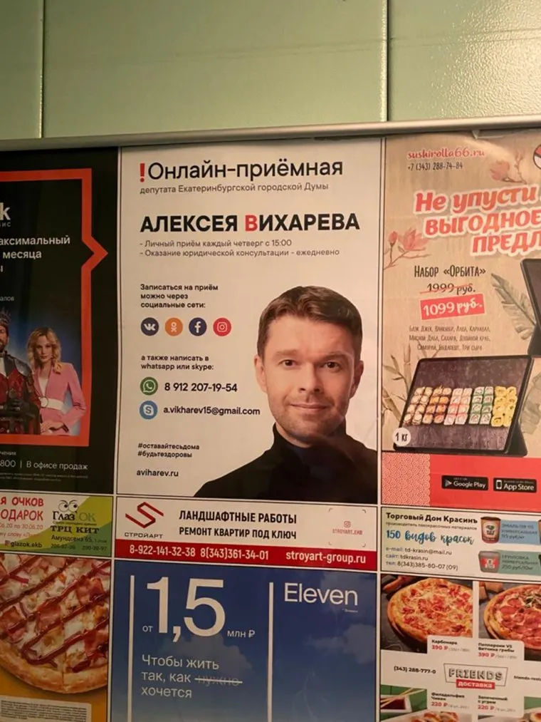 Ряд депутатов гордумы Екатеринбурга в кулуарах выражает недовольство тем, что листовки с изображением депутата Алексея Вихарева распространяются в их избирательных округах, сообщают источники URA.RU в думе. В листовках, которые, по информации агентства, появились в лифтах домов по всему городу, Вихарев рассказывает, как можно попасть в его приемную, и делится контактными данными.