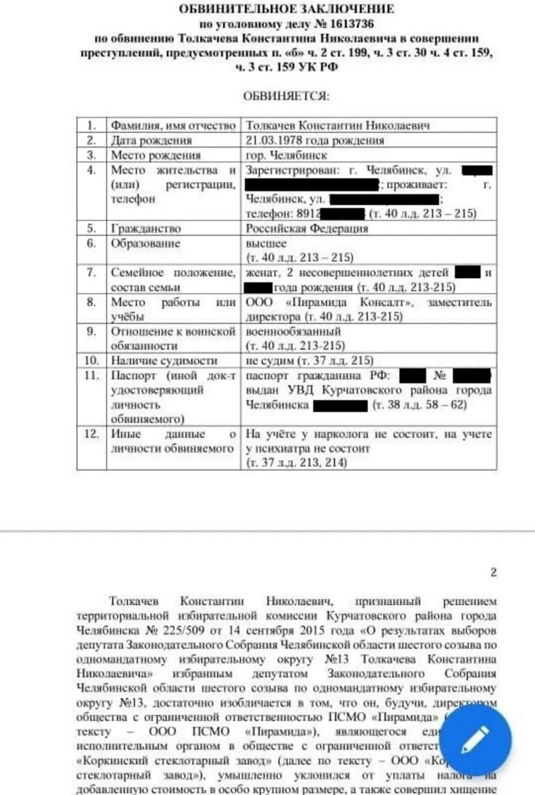 Дело Толкачева поступило в суд 3 марта. По версии обвинения , он заключил фиктивные сделки об аренде имущества ООО «Коркинский стеклотарный завод», которым управляло его ООО ПСМО «Пирамида». Ему удалось снизить налоговую базу, не доплатив 16,3 млн рублей НДС. Кроме того, депутат якобы документально не оформил другую сделку, чтобы сэкономить 591 тысячу рублей НДС. Действия Толкачева квалифицировали по ч.3 ст. 159 (мошенничество в крупном размере), ч.3 ст. 30, ч.4 ст. 159 (покушение на мошенничество) и п.б ч.2 ст. 199 (уклонение от уплаты налогов в особо крупном размере) УК РФ.