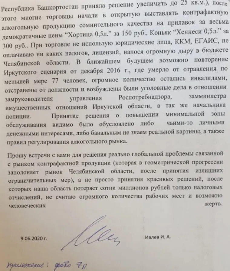 «В ближайшем будущем возможно повторение иркутского сценария от декабря 2016 года, где умерли от отравления по меньшей мере 77 человек, огромное количество осталось инвалидами, отстранены от должности чиновники, возбуждены уголовные дела», — предупреждает Ивлев. Он просит губернатора о встрече для обсуждения проблемы нелегальной торговли спиртным.