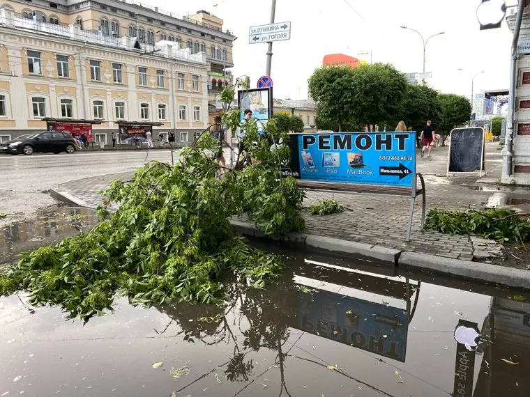 В распоряжении URA.RU появились фотографии из центра Екатеринбурга. На пересечении улиц Толмачева и Малышева на землю повалились ветки деревьев.