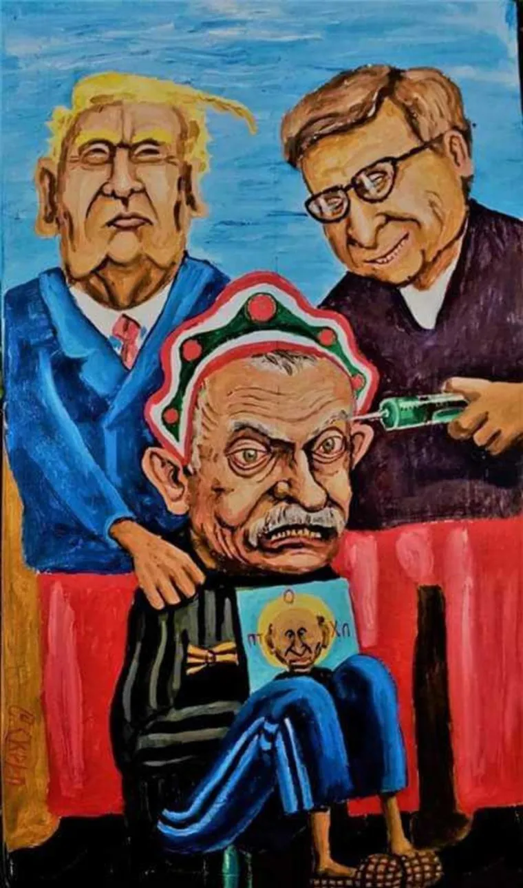 Карикатура, на которой Гейтс вновь якобы вводит чип Михалкову через вакцину