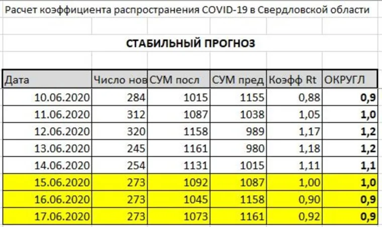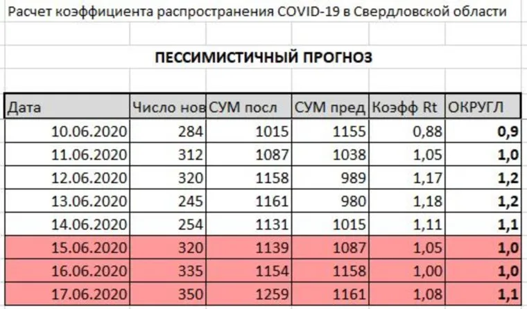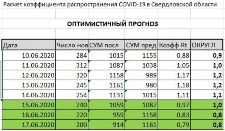 По методике Роспотребнадзора, он высчитывается как сумма новых случаев заболевания за последние четыре дня, поделенная на сумму за предыдущие четыре дня. Если для первого этапа требовалось, чтобы Rt был не больше единицы, то для второго — не более 0,8. Всплеск заболеваемости на днях (11 и 12 июня было 312 и 320 заболевших) привел к тому, что на 14 июня коэффициент Rt регионе превысил единицу и составил 1,1. Но последние два дня шло снижение числа новых случаев коронавируса (13 июня — 245, 14 числа — 254 ). Если эта тенденция сохранится, то к середине недели значение Rt, равное 0,8, будет достигнуто.