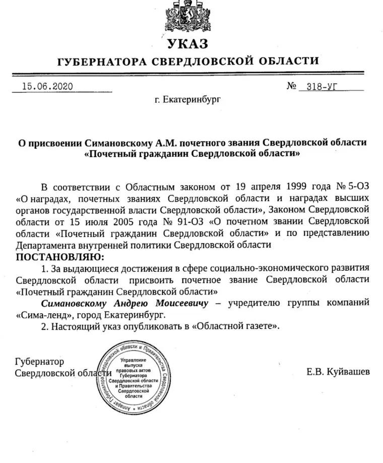 Свердловский губернатор Евгений Куйвашев подписал указ о присвоении звания «Почетный гражданин Свердловской области» учредителю группы компаний «Сима-Ленд» Андрею Симановскому, сообщил инсайдер URA.RU.