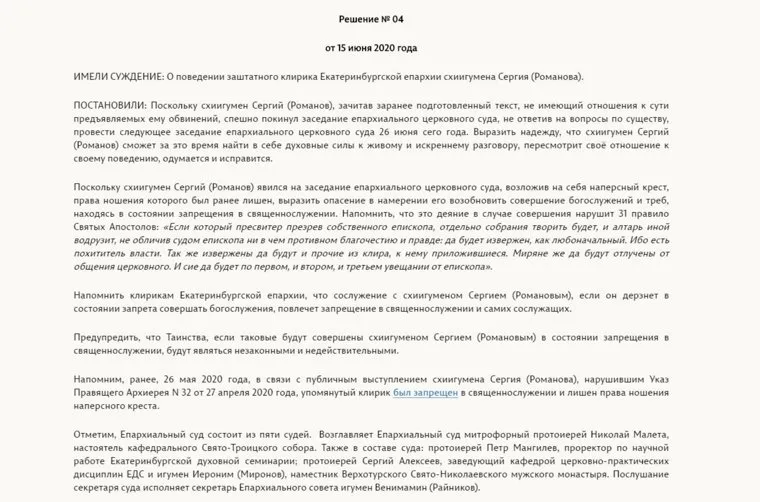 «Поскольку схиигумен Сергий (Романов), зачитав заранее подготовленный текст, не имеющий отношения к сути предъявляемых ему обвинений, спешно покинул заседание епархиального церковного суда, не ответив на вопросы по существу, провести следующее заседание епархиального церковного суда 26 июня сего года, — говорится в решении суда. — Выразить надежду, что схиигумен Сергий (Романов) сможет за это время найти в себе духовные силы к живому и искреннему разговору, пересмотрит своё отношение к своему поведению, одумается и исправится».