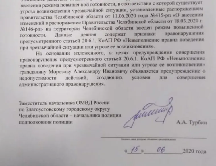 «В Челябинской области введен режим повышенной готовности. Действия Морозова содержат признаки административного правонарушения по ст. 20.6.1 КоАП [невыполнение правил при ЧС или угрозе ее возникновения]. На основании изложенного, Морозову объявляется предупреждение о недопустимости действий, создающих условия для совершения административного правонарушения», — сказал собеседник в полиции.