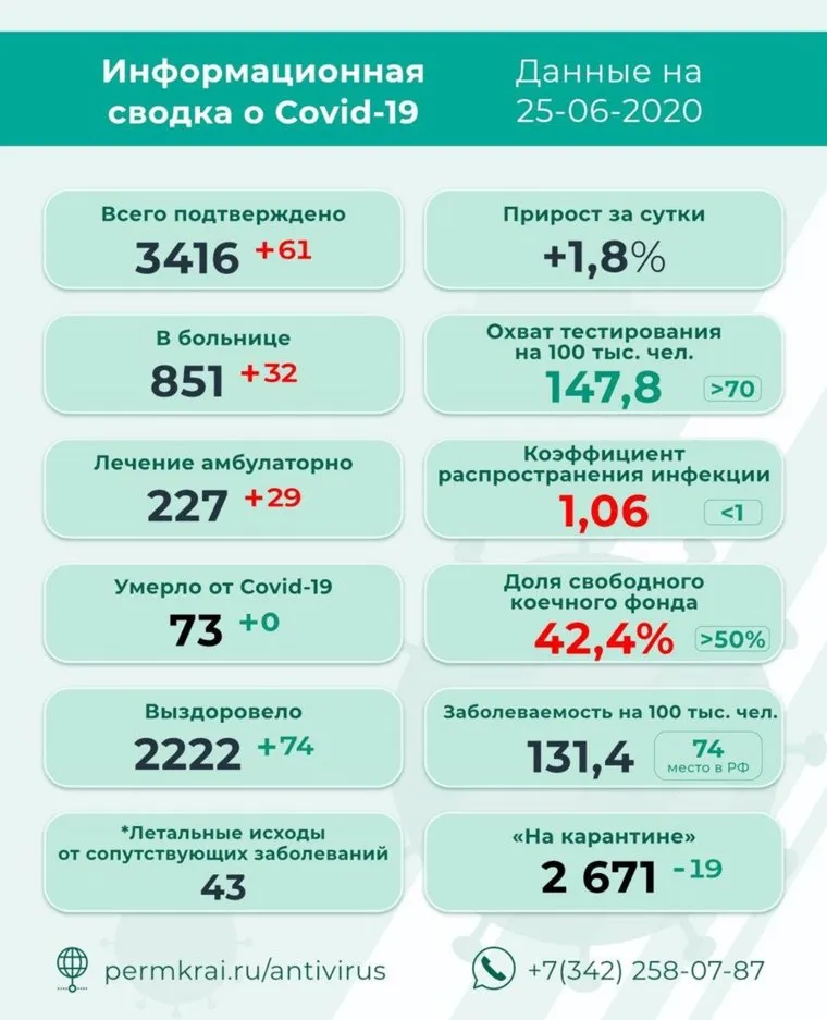 К утру 25 июня в Пермском крае зафиксирован 61 новый случай заражения коронавирусом, сообщает федеральный оперативный штаб по борьбе с инфекцией. Накануне было поставлено 89 положительных диагнозов. Эта ситуация не позволяет говорить о возможном переходе ко второму этапу снятия ограничений.