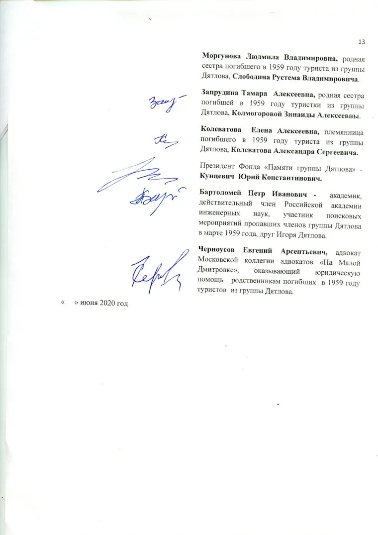 … президента Фонда памяти группы Дятлова Юрия Кунцевича, активиста фонда — академика Петра Бартоломея и адвоката фонда Евгения Черноусова