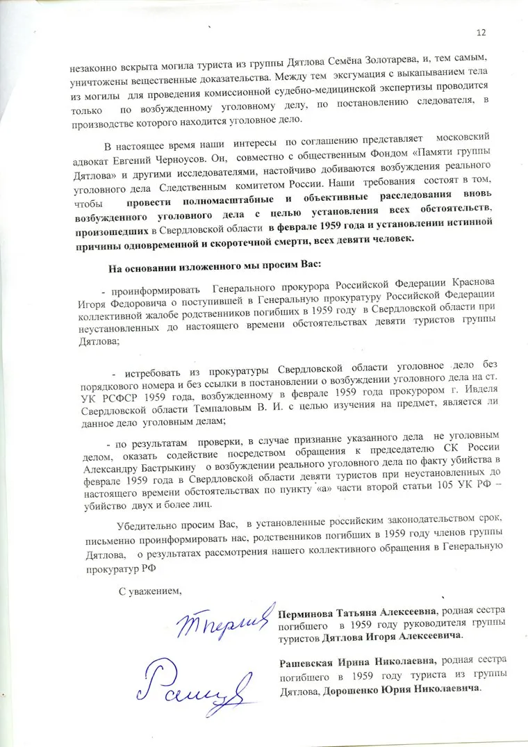 «Просим вас истребовать из прокуратуры Свердловской области уголовное дело, возбужденное в феврале 1959 года прокурором г. Ивделя Свердловской области Темпаловым В. И. с целью изучения, является ли данное дело уголовным делом, — говорится в обращении. — По результатам проверки в случае признания его не уголовным делом оказать содействие посредством обращения к председателю СК России Александру Бастрыкину о возбуждении реального уголовного дела по факту убийства в феврале 1959 года девяти туристов»
