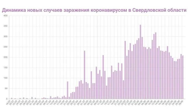 Рост числа новых случаев заражения коронавирусной инфекцией начался сразу после введения в Свердловской области второго этапа снятия ограничений (это произошло 26 июня по указу губернатора Евгения Куйвашева). Перед этим в регионе фиксировалось постепенное стабильное снижение заболеваемости (21 июня — 207 , 22-го — 197 , 23 числа — 181 , 24-го — 181), 25 и 26 июня были показатели 192 и 193 заболевших в сутки).