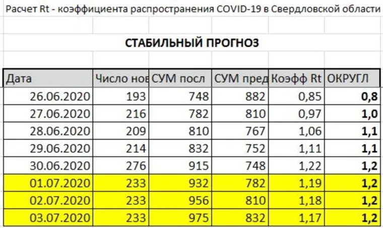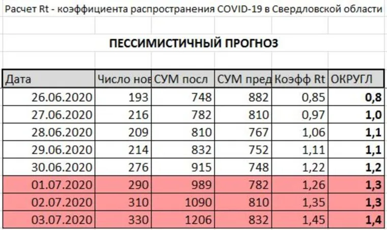 Из-за всплеска заболеваемости коэффициент распространения инфекции (Rt) в регионе сейчас составляет 1,2 (по нормам Роспотребнадзора, первый этап снятия ограничений вводится при коэффициенте Rt 1,0, второй — при 0,8. Таким образом, Свердловская область вышла в «красную зону» (когда возможна отмена ряда послаблений карантина). Даже при оптимистичном прогнозе (если число новых случаев в ближайшие дни снизится до 200 и ниже), коэффициент Rt будет оставаться выше единицы. Тем более — если заболеваемость будет расти (1,2, если ситуация будет сохраняться, как сейчас, и до 1,4, если всплески заболеваемости продолжатся -см. ТАБЛИЦЫ).