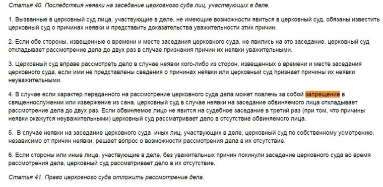 По его данным, в этом раз какое-то решение все же будет принято. «По канонам церкви, человека нельзя судить церковным судом без его присутствия, но случаи неявки церковным правом также предусмотрены, — пояснил священник. — По положению о церковном суде , после трех неявок на суд без уважительной причины дело может быть рассмотрено заочно (без участия „фигуранта“)». Сам отец Сергий накануне заявил, что придет на суд, но выдвинул условие .