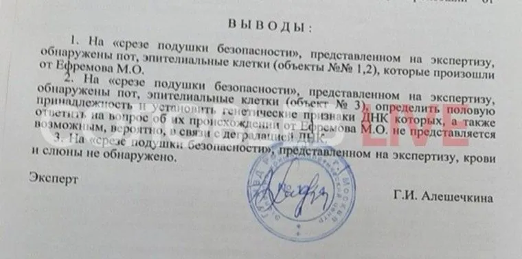 «На „срезе подушки безопасности“, представленном на экспертизу, обнаружены пот, эпителиальные клетки, которые произошли от Ефремова», — говорится в выводе экспертизы, которую журналист показал в прямом эфире на youtube-канале «Соловьев LIVE». При этом телеведущий не стал говорить, откуда у него появились фотографии документа, объяснив это «журналистской тайной».
