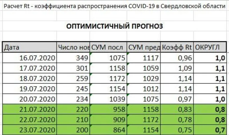Число новых заболевших в регионе уменьшается с каждым днем, вчера — 245 заболевших за день. Сегодня коэффициент распространения инфекции (Rt) составляет сейчас 0,97 (см. ТАБЛИЦУ). Но несмотря на оптимистичный показатель, регион с 16 июля занимал второе место в стране, после Москвы, по ежедневному приросту новых зараженных, сегодня Свердловская область оказалась на третьем.