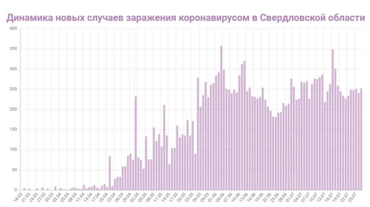 По данным санитарных врачей (сводка за 26 июля), в Свердловской области больше всего заболевших в Екатеринбурге (12228), в Нижнем Тагиле (1087), Первоуральске (514), Верхней Пышме (483), Березовском (383) Ревде (270), Каменске-Уральском и Каменском районе (242), Нижнесергинском районе (229), Невьянске (217), Реже (включая район — 215), Полевском (175), Асбесте (168), Красноуфимском районе (158), Краснотурьинске (154), Серове (147), Артемовском и Белоярском районе (139), Кировграде (134), Ирбите (вместе с районом — 132), Арамили (121), Камышловском районе (119), Среднеуральске (117), Сысерти (114), Туринске (100), Алапаевске (с учетом районе — 91), Верхотурье и Кушве (89), Горноуральском городском округе (86), Верхней Салде (74), Талицком районе (68), Дегтярске (67), Североуральске (62).