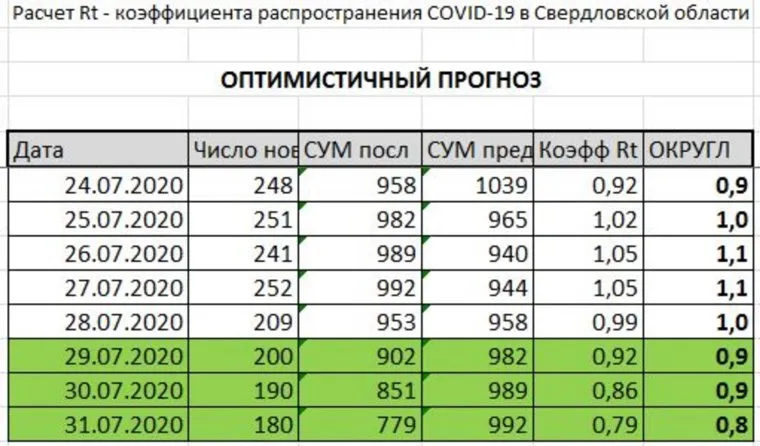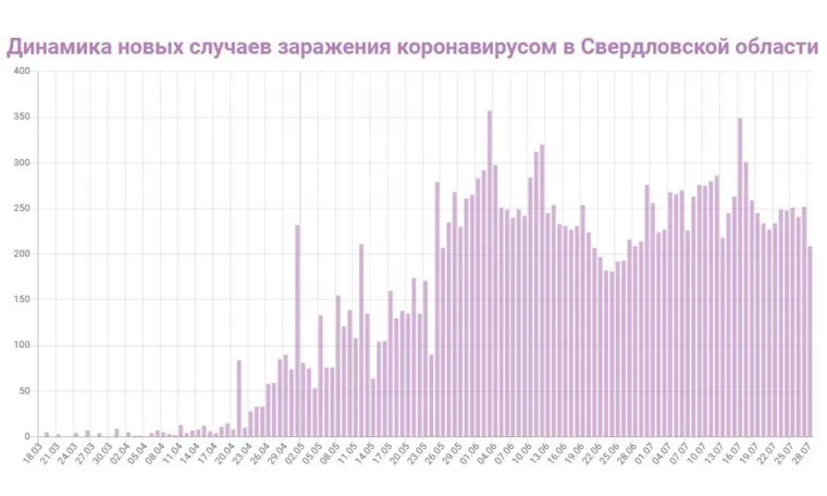 Число новых случаев заболевания COVID в регионе в последние дни находилось около цифры 250: 23 июля было выявлено 249 заболевших , 24-го — 248 , 25-го числа — 251 , 26-го — 241. Накануне в Свердловской области было зафиксировано 252 новых случая коронавируса. Сегодня в регионе впервые фиксируется ощутимый спад заболеваемости. Коэффициент распространения инфекции (Rt) при этом оказался меньше единицы (0,99) (также впервые за последние дни). При дальнейшем снижении регион может выйти на коэффициент Rt 0,8 (какой и должен быть на втором этапе снятия ограничений).