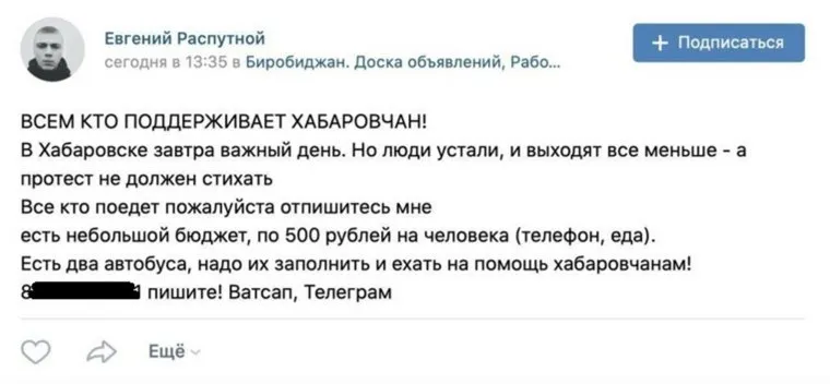 По данным, распространяемым в telegram-каналах, некоторые лица публикуют в соцсетях сообщения, в которых предлагают жителям соседних городов поехать в Хабаровск за 500 рублей и еду. «Есть два автобуса, надо ехать на помощь хабаровчанам. Есть небольшой бюджет, по 500 рублей на человека», — говорится в скрине поста, опубликованного telegram-каналом «Регионал».