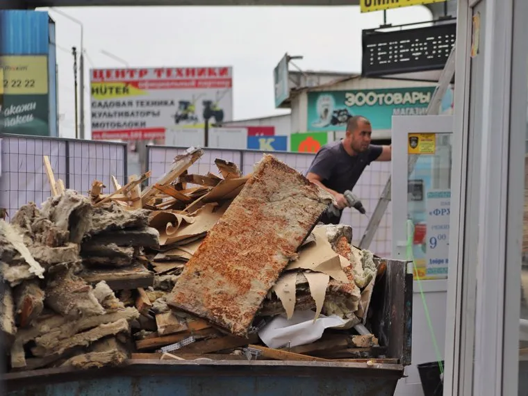 Рабочие разбирают павильоны на курганском рынке