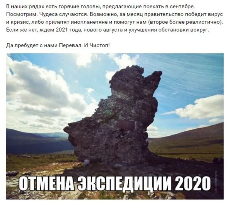 Группа на Чистоп до последнего готовилась к старту, надеясь на отмену режима (так как на Севере уже пошли дожди), однако режим ЧС до сих пор не снят. «В наших рядах есть горячие головы, предлагающие поехать в сентябре. Посмотрим. Чудеса случаются. Возможно, за месяц правительство победит вирус и кризис, либо прилетят инопланетяне и помогут нам (второе более реалистично), — пошутил Королев. — Если же нет, ждем 2021 года».