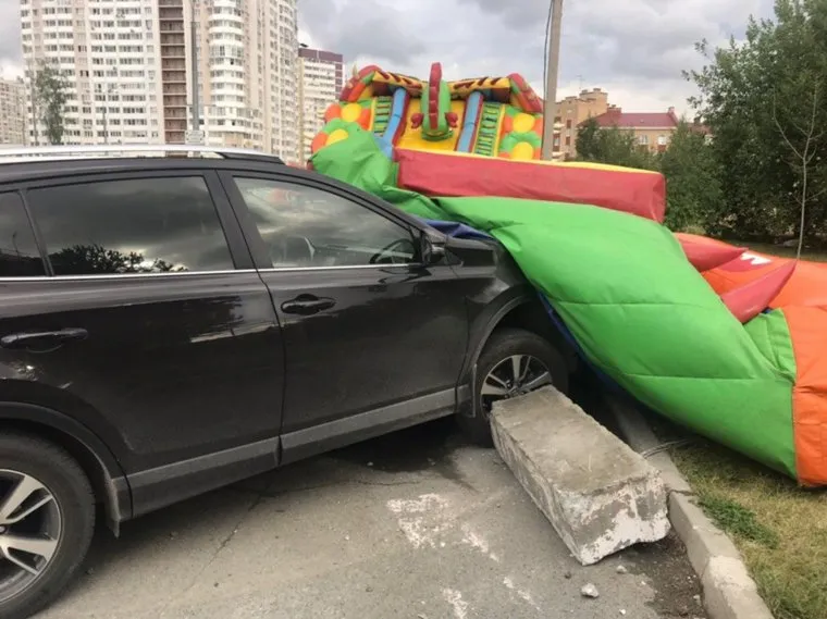 В Екатеринбурге на улице Краснолесья внедорожник на скорости въехал в надувной батут. Об этом URA.RU рассказали свидетели происшествия.
