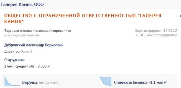 Теперь Дубровский-младший руководит только одной фирмой — ООО «Галерея камня», где он сам, согласно сервису СБИС, является учредителем и единственным сотрудником. Сама компания не ведет финансовую деятельность. В собственности Дубровского-младшего осталось еще четыре актива — «ЧСК», УК «Станичная», «Песчано-Гравийный карьер» и «МСК».