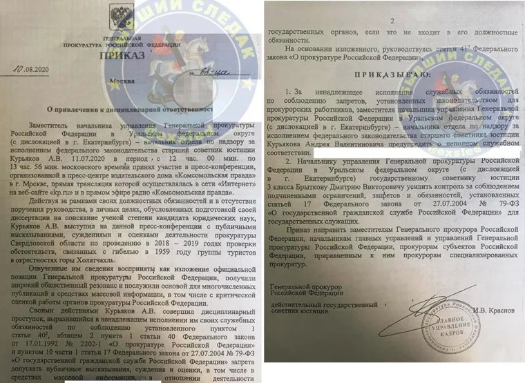 Родственники туристов-дятловцев, погибших в 1959 году на Северном Урале, и активисты фонда памяти группы Дятлова направили обращение в Генпрокуратуру с просьбой наказать замначальника управления Генпрокуратуры в УрФО Андрея Курьякова. Поводом стало его выступление без служебной формы на пресс-конференции в «Комсомольской правде» 11 июля 2020 года о том, что причиной гибели туристов стала лавина.