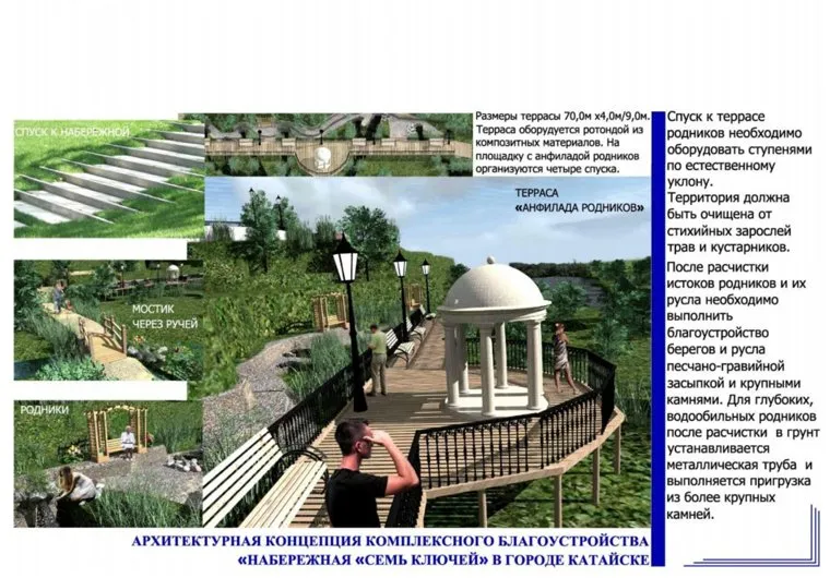 В паспорте объекта указано, что на набережной разместят универсальную спортивную площадку, веревочный парк, площадки для воркаута, тренажеров, выгула собак, тихого отдыха, смотровую площадку, террасу «Анфилада родников» и парковку. Строительство набережной началось в августе и должно закончиться 30 октября.