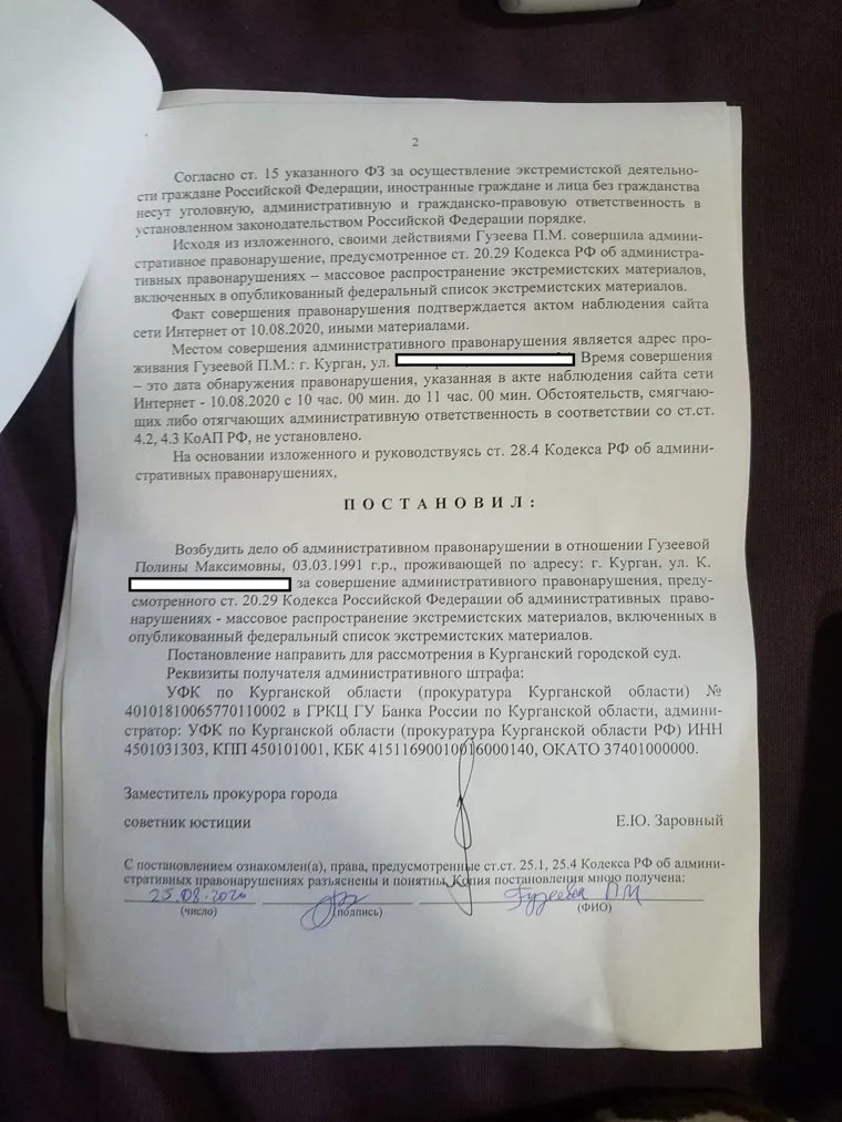 Позже девушке сообщили из прокуратуры, что в отношении нее возбуждено административное дело по статье 20.20 КоАП «Массовое распространение материалов, включенных в опубликованный федеральный список экстремистских материалов». Скоро будет суд, девушке грозит штраф от тысячи до трех тысяч рублей. Редакция URA.RU пыталась получить комментарий в прокуратуре Курганской области, но в пресс-службе телефон не отвечает.