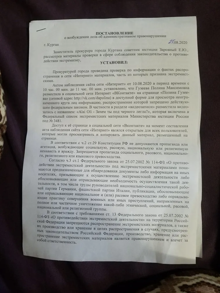 Полина прописана в Екатеринбурге, но работает сейчас в мастерской в Кургане. Там ее и разыскал полицейский 10 августа. «Он сообщил мне, что я являюсь распространителем запрещенных материалов. Что по поиску можно на моей открытой странице найти песню, которая запрещена с 2016 года — клип группы Alai Oli „Зачем ты под черного легла“. А сохранила я ее у себя в хранилище в 2010 году. Это даже не репост, только в хранилище была, и я давно забыла о ней», — говорит Полина Гузеева.