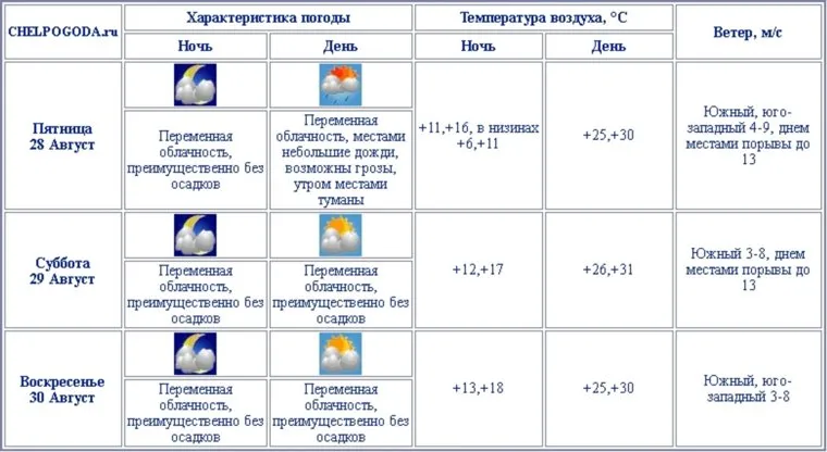 Днем 29 августа воздух прогреется до 29-31 градуса, 30 августа прогноз обещает 25-30 градусов. Не будет и обычных в последние недели ночных похолоданий, и после заката солнца температуры останутся вполне летными — до 17-18 градусов. По данным Челябинского ЦГМС, ожидается переменная облачность, без дождей. В субботу ветер может усилиться до 18 метров в секунду, но в воскресенье спадет до обычных 3-8 метров в секунду.