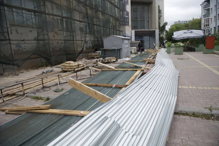 Информация об упавших деревьях поступает из разных концов Екатеринбурга. Как правило речь идет о старых деревьях, которые падают на автомобили, на проезжую часть. Возле бывшего кинотеатра «Салют» сильный ветер повалил забор, которые поставили рабочие, ремонтирующие здание.