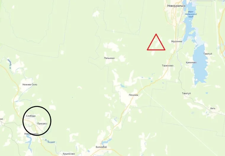 Красный треугольник — выделенный участок для добычи золота на реке Черный Шишим. Черный круг — поселок Коуровка (села Слобода, Прогресс), где загрязненный Шишим впадает в Чусовую
