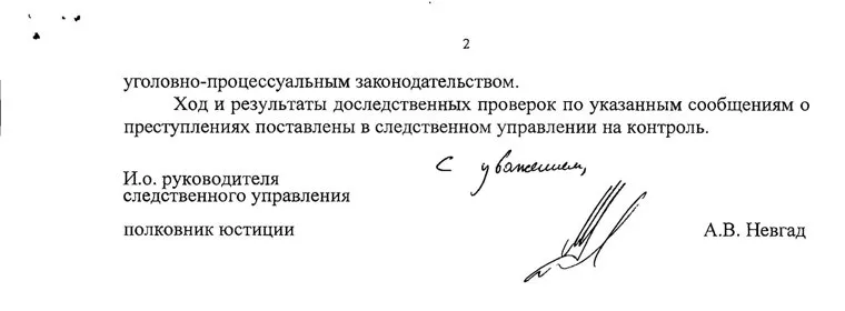 «В производстве следственного отдела по г. Верхняя Пышма находится материал проверки №426пр-10 по факту воспрепятствования законной деятельности журналистов Собчак К.А. и Ерженкова С. Б, сопряженного с применением насилия в отношении них и повреждением их имущества, то есть по признакам преступления, предусмотренного частью 3 статьи 144 УК РФ» — говорится в документе за подписью замглавы свердловского следкома Алексея Невгада (ранее проверку по факту нападения на съемочную группу вела полиция ).