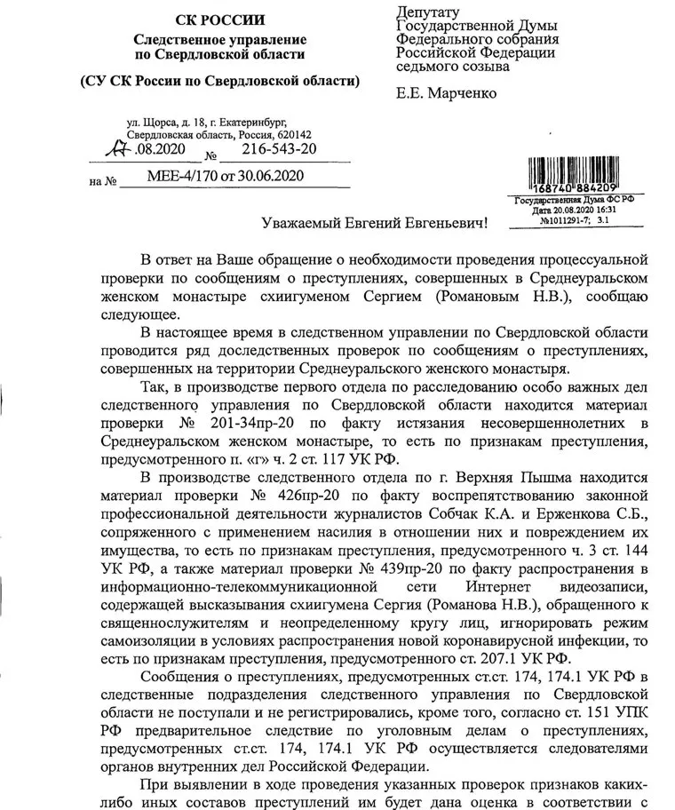 Следователи нашли новые составы возможных преступлений схимонаха Сергия (Романова) — духовника Среднеуральского женского монастыря. Об этом говорится в ответе свердловского следкома на запрос депутата Госдумы Евгения Марченко (есть в редакции URA.RU). Кроме проверки по фактам истязаний несовершеннолетних в монастыре (за нее следователи взялись еще в июле), СК ведет еще две проверки.