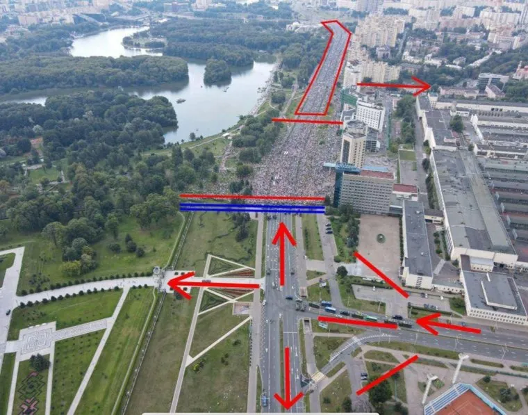 Участникам мирных акций протеста в Беларуси рассказали о тактике взятия Дворца Независимости. Карту с планом передвижений опубликовал telegram-канал Nexta Live.