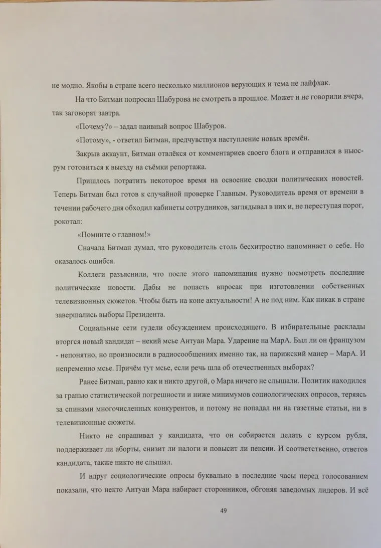 Действие романа происходит в Екатеринбурге в 2015 году. По сюжету, город посещает дьявол, который хочет принять участие в выборах президента страны. Действующие лица — сотрудники телекомпании Екатеринбурга; одна из сюжетных линий посвящена резонансному конфликту у похоронного дома «Вознесение» . В романе фигурируют свердловские и федеральные политики, журналисты, в том числе URA.RU, клирик РПЦ, а одна из ключевых сцен разворачивается в ресторане «ХмелиСупЕли», который по описанию напоминает заведение «Хмели Сунели».