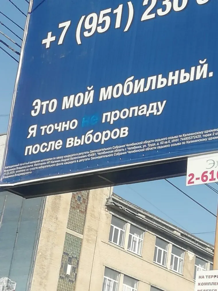 Кандидат в заксобрание Челябинской области от «Единой России» Владимир Бодров написал заявление в полицию на хулиганов, испортивших его агитационные баннеры. В слогане «Я точно не пропаду после выборов» неизвестные закрасили слово «не», сообщил он корреспонденту URA.RU.