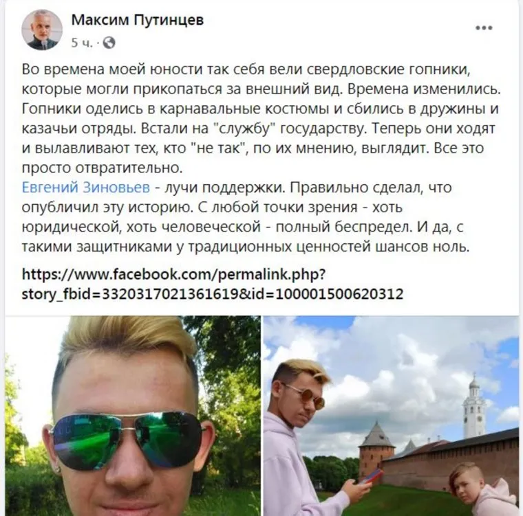 Накануне Евгений Зиновьев рассказал на своей странице в соцсетях о том, что его сына Александра в центре Екатеринбурга остановили два казака, интересовавшиеся, не относится ли он «к этим?» Служивых привлек внешний вид юноши: блестящие очки с оранжевыми линзами, крашеные волосы, серьга в ухе с бриллиантом. По словам самого парня, так он «самовыражается через внешний вид». Но все это не понравилось казакам: один из которых предложил «вязать его». Пост Зиновьева собрал сотни просмотров и десятки комментариев в духе «в 90-е так вели себя гопники».