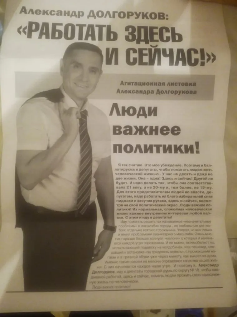 «Добротными и солидными выглядят газеты кандидата-единоросса [в депутаты свердловского заксобрания] Петра Соколюка. Классическая триада: было-есть-будет», — прокомментировал Михаил Коробельников.