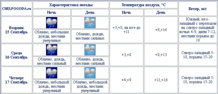 «Ухудшение погоды начнется в ночь на вторник, когда температура упадет до трех градусов и начнутся сильные осадки. Днем потеплеет до 9-14 градусов, но дожди продолжатся», — прогнозирует Челябинский ЦГМС. Более того, осадки обещают быть непрерывными 15, 16 и 17 сентября. При этом на два дня ветер превратится в штормовой, достигая 20 метров в секунду.