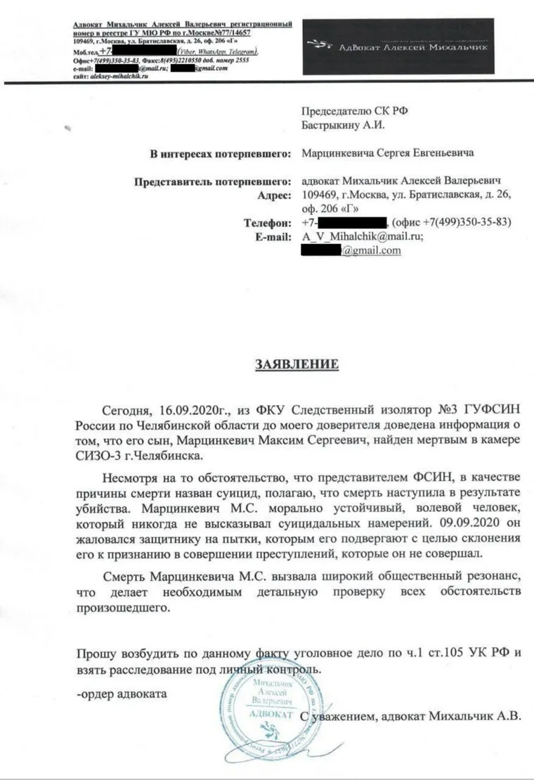 «Полагаю, что смерть наступила в результате убийства. Марцинкевич морально устойчивый, волевой человек, который никогда не высказывал суицидальных намерений. 09.09.2020 он жаловался защитнику на пытки, которым его подвергают с целью склонения его к признанию в совершении преступлений, которые он не совершал… Прошу возбудить по данному факту уголовное дело по ч.1 ст. 105 УК РФ и взять расследование на личный контроль», — говорится в обращении адвоката, опубликованном телеграм-каналом Baza.