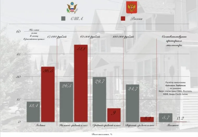 «Если мы поставим планку, при которой в Америке живет треть населения, 33%, то у нас это будет 100 тысяч на человека. И таких у нас останется 3,4%. То есть в 11 раз меньше, чем в Америке», — заключил Любич.