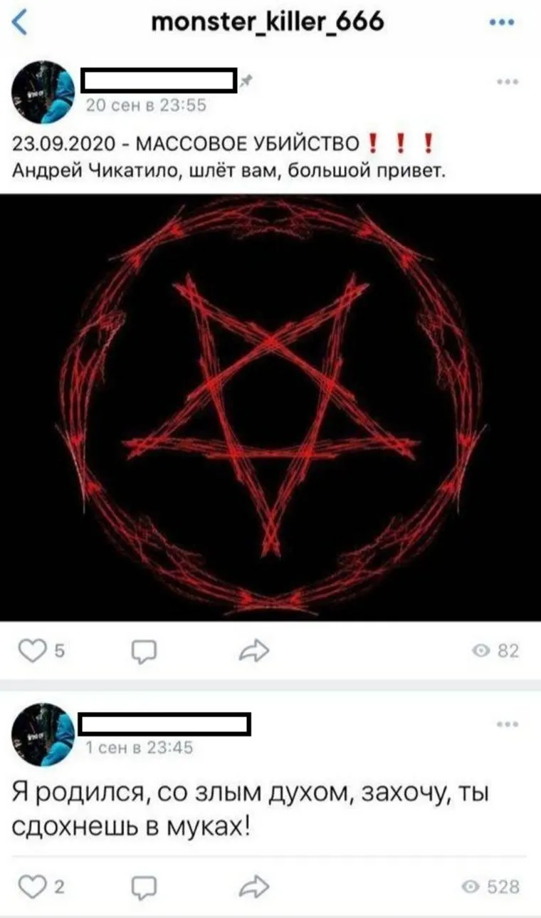 «Все эти предметы были приобретены недавно, только что купленные ножи парень даже не успел распаковать. В принадлежащих ему тетрадях была обнаружена сатанистская символика и повторяющаяся дата — 23 сентября», — добавил источник.