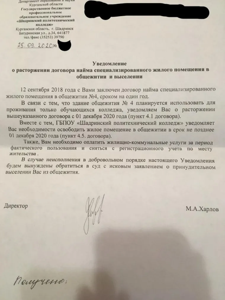 Обновлено 30.09 в 11:53: В департаменте информационной и внутренней политики URA.RU прокомментировали, что сейчас идет инвентаризация студенческих общежитий. В адрес 11 квартиросъемщиков, не являющихся студентами, были вручены уведомления о расторжении договора найма специализированного жилого помещения в общежитии и выселении. «Люди предупреждены о необходимости поиска жилья, так как истек либо истекает в ближайшие дни срок договора. Принудительно выселять людей не будут, колледжем будут направлены исковые заявления в суд. Департаментом образования и науки Курганской области и Администрацией города Шадринска рассматриваются все возможные варианты решения этой проблемы», — отметили областные власти.