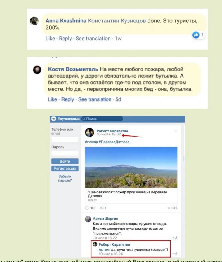 По факту пожара в заповеднике в 2020 теперь тоже заведено уголовное дело , и краеугольнй вопрос — почему там горят леса? Летом директор заповедника Анна Квашина сообщала, что причина возгораний — природный фактор (жара и грозы). Но, комментируя пожары на перевале Дятлова, она говорила: «Это туристы. 200%». Такая же оценка звучала и поводу пожара 2010 года в заповеднике: «У меня почти нет сомнений — это поджог», — говорила она десять лет назад.