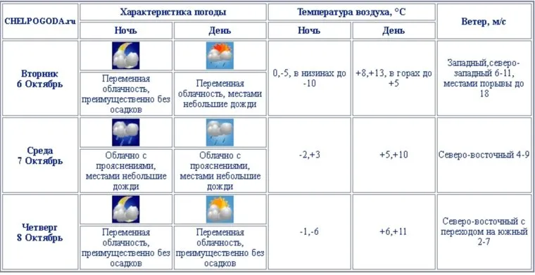7 октября ночью прогнозируется от минус двух до плюс трех градусов, днем — 5-10 градусов тепла. В ночь на 8 октября местами похолодает до минус шести, днем будет 6-11 градусов.