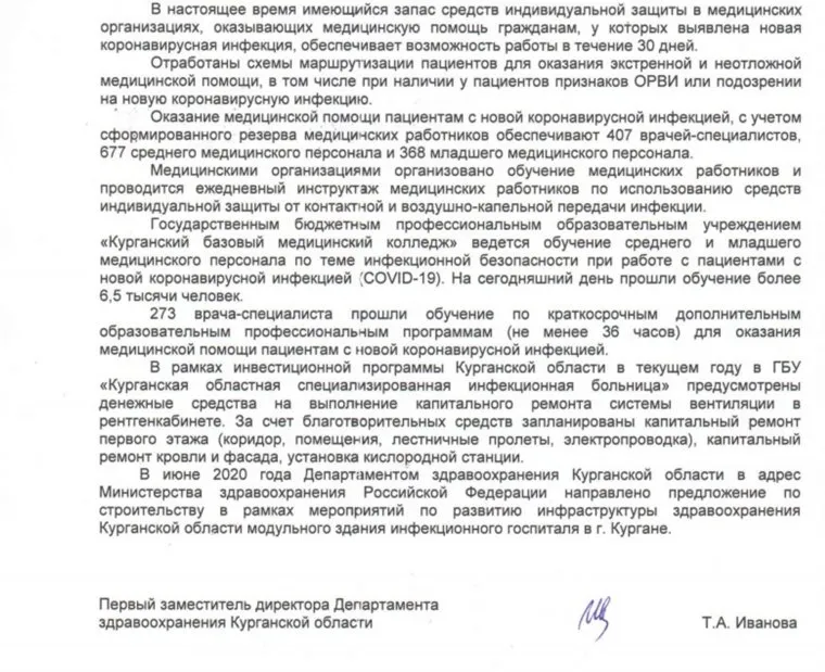 Этот ответ направлял департамент здравоохранения сотрудникам Курганской областной больницы