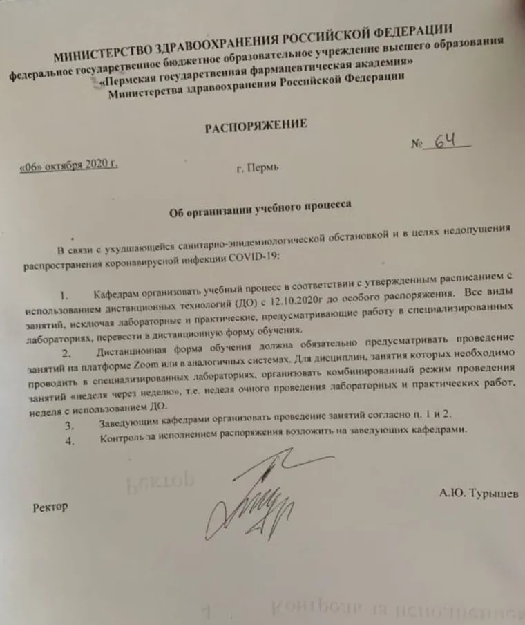 Вуз перейдет на дистант с понедельника, 12 октября. «Кафедрам организовать учебный процесс с использование дистанционных технологий с 12.10.2020 до особого распоряжения. Все виды занятий, исключая лабораторные и практические, предусматривающие работу в специализированных лабораториях, перевести в дистанционную форму обучения», — указано в распоряжении ректора фармакадемии.